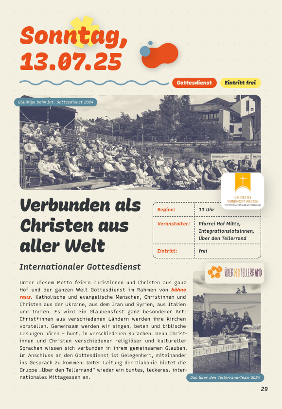 Das Dekanat Hof und die Gemeinden der Innenstadt laden am 13.07 um 11:00 Uhr herzlich zum Internationalen Gottesdienst ein.